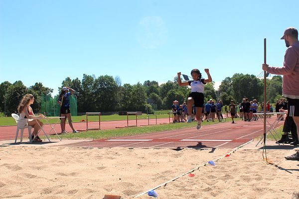 Das Wetter bot optimale Bedingungen und unsere Fünftklässler zeigten mit großem Eifer all ihr Können in den Disziplinen Sprint, Weitsprung und Medizinballstoßen. Den krönenden Abschluss boten die Klassenstaffeln über 8 x 50 m, die jeweils von vier Mädchen und vier Jungen unter lauten Anfeuerungsrufen ihrer Mitschüler bestritten wurden.