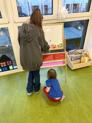 Wir haben für die Kinder Plätzchen gebacken und haben sie dann mit in die Kita genommen, damit wir sie mit den Kindern gemeinsam dekorieren können. Wir haben noch mit den Kindern gespielt und hatten noch Ausmalbilder dabei.