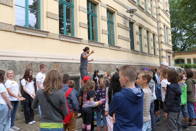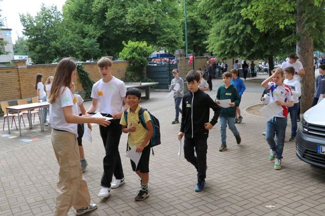 In unseren Schüler-Guide-Outfits begrüßten wir die ebenfalls aufgeregten neuen Schüler. Die Eltern und manche Großeltern erhielten in der Aula wichtige Informationen zum Schulstart im August, während wir mit den Kleinen auf dem Schulhof einzelne Stationen durchliefen.